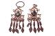 Nauhalla toisiinsa yhdistetyt korvariipukset. Kummassakin punainen ja vihreä koristekivi.