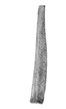 Sukkapuikkokotelo, ontto, toisesta päästä avoin luu. Koristettu toisiaan leikkaavin suorin viivoin, joiden välissä on pisteitä.