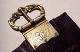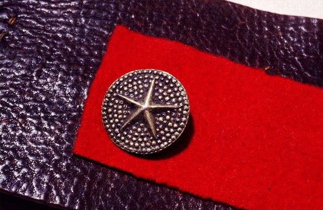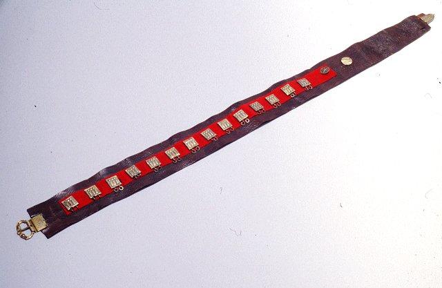 Vyö, jonka päälle kiinnitetty punainen verkakaistale, ja tämän päälle nelikulmaisia koristeheloja 14 kpl, sekä litteä messinkinappi, jossa tähtikuvio. Kullatut soljet.