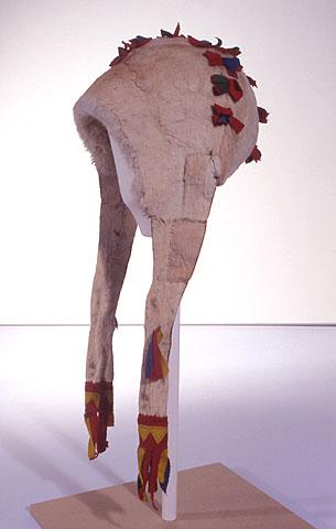 Naisen ajolakki, uudehkoa mallia. Pesä ommeltu neljästä kairasta, jotka ovat valkeaa vasantaljaa, saumoihin sovitettu punaisesta, sinisestä ja vihreästä verasta tehtyjä koristehetaleita. Niskassa sisäpuolella pehmeästä valkeasta turkiksesta tehty reunus. Vuori vihreää kangasta. Lakki on varustettu valkeasta vasantaljasta tehdyillä pitkillä korvuksilla, joiden keskikohdalla ja päissä on punaisesta, sinisestä, keltaisesta ja vihreästä verasta tehdyt koristehetaleet.