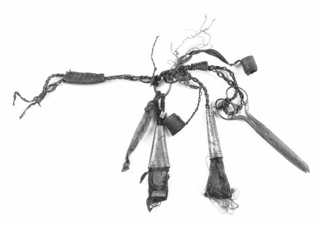 Vyölliset, renkaasta riippuu nahkakannikkeissa kahdet sakset ja kaksi neulikkoa. Toinen neulikkoputkista on lattea, toinen liereä. Kaikki metalliosat ovat rautaa. Pienemmät sakset ja liereä neulikko saattavat olla jälkeenpäin kiinnitetyt renkaaseen.