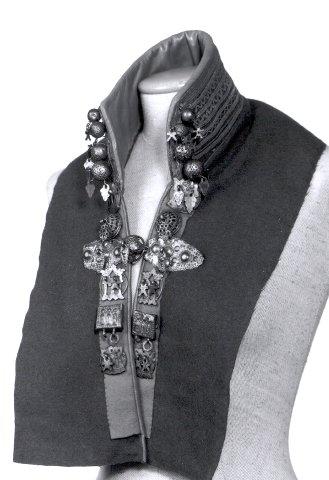 Hopeakaulus, sinivihreää verkaa, rinta-aukko reunustettu punaisella verkakaistaleella. Kauluksen sisäpuoli on vuorattu vaaleanruskealla pehmeällä nahkalla. Samalla materiaalilla on reunustettu myös pääntie. Vaatekappale on täysin avoimeksi leikattu. Punainen verkakaitale, n. 3 cm leveä, reunustaa rintahalkiota ja toimii samalla korujen taustana. Varsinainen kaulus koristettu kaluunamaisesti ryhmitetyin tinalangoin, jotka muodostavat sekä suoria että murtoviivoja. Kauluksen etureunassa neljä paria kullattuja pallomaisia hopeanappeja. Rinta-aukon reunassa kullattuja erimuotoisia hopeaheloja: kolme paria isoja M-majuskeleja, yksi pari puhkonaisia puolipallomaisia ja yksi pari neliömäisiä, viime mainituissa nähdään kolme palloon päättyvää "pylvästä", sekä iso hopeahakanen. näyttää malliksi tehdyltä vanhoja osia hyväksi käyttävältä.