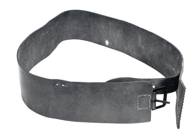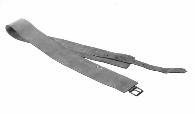 Miehen vyö, kokonaan ostoaineista tehty, solki tehdastekoinen, mustaksi lakattu, rei'ät lyöty stanssilla. Toinen pää hammastettu, samaten kepean tiukennushihnan vapaa pää. Solkipään lähellä reunassa kaksi vierekkäistä nelikulmaista reikää puukon ripustamista varten. MITAT: pituus 139,5 cm, leveys 8 cm, tiukennushihnan leveys 3 cm