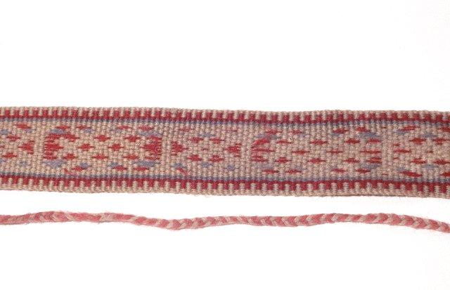 Miehen paulat, vanhat, käytössä olleet. Ruvu-osa kummassakin paulassa korjailtu ja uusittu. Paulan nyöriosan puoleinen pää vahvistettu punaisella verkalapulla. Paulojen reunukset puna-valkeat, kuvio-osa sini-punainen valkealla pohjalla. Pärges punottu eri langasta kuin paula, se on puna-valkea. Vuodtan pituus n. 122 cm, leveys 5 cm, pärgesin pituus n. 80 cm