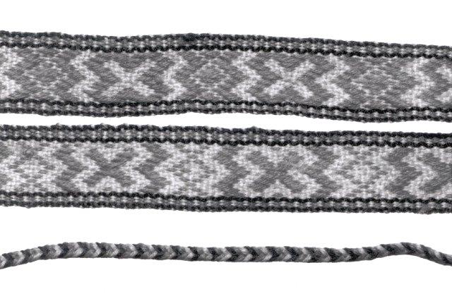 Paulat, pirtanauhat, kuviolliseksi poimittu, reunat raidalliset, loimiripsiä. Loimi ja kude on 4-säikeistä villalankaa, kude sinapinkeltaista, joten kuvio-osan pohjakudos on keltainen palttina. Muut värit punainen ja musta. Päät on taitettu ja ompelukoneella vahvistettu. Toisessa päässä on 12 cm pituinen 3-värinen palmikko ja toisessa päässä tupsullinen 40 cm pitkä 3-väripunos.
