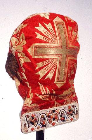Punaisesta ja kullanvärisestä ostokankaasta ommeltu leskenlakin mallinen päähine. Etureuna koristeltu päälleommellulla kankaalla, niskakappale koristeltu erilaisin helmin, napein ja paljetein.
