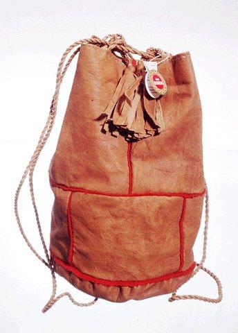 Pussi koostuu kolmesta osasta: yläosasta, alaosasta ja pohjasta. Yläosa muodostuu kahdesta kappaleesta ja alaosa neljästä nahkatilkusta. Pohja on pyöreä ja se on kiinnitetty alaosaan poimutettuna. Kaikissa saumoissa on punaiset verkatereet. Pussi on vuoritettu punapohjaisella puuvillakankaalla. Pussin suussa on kahdeksan nahkanyörilenkkiä, joiden läpi kulkee kaksi nahkanyöriä, joilla pussin suu kiristetään kiinni ja joista pussia voi kantaa. Kiristysnyörien päät on jätetty tupsuiksi sivuille. Pussin nahkakappaleet on käsin ommeltu, mahd. jänne- tai suonilangalla. Pussiin kiinnitetty Sami Duodji -tuotemerkki, numero 82325. Naisen käsilaukku, poron sisnanahkaa. Korkeus venyttämättä n. 29 cm, leveys n. 26 cm. Pohja tasainen, matala, pyöreä, yhdestä nahankappaleesta; saumattu kiinni keskiosaan, joka muodostuu neljästä nahankappaleesta ja on n. 10 cm korkea. Se on saumattu kiinni suuosaan. Noin 16 cm korkea suuosa on kahdesta nahankappaleesta. Laukku suljetaan suuosan suuhun ommellun kuuden punottua sisnahakaa olevan silmukkaraksin kautta kahtena nyörina juoksevan punotun sisnanahkanauhan avulla; näin pussi sulkeutuu ja samalla muodostuvat kantohihnat. Pussi on vuorattu kukallisella kankaalla. Kantonyörien lähtökohdassa sivusaumojen yläpäässä on leikellen muodostetut sisnanahkaiset koriste-"tupsut", ne riippuvat tietenkin alaspäin. Suu vahvistuu siten, että pussin perusnahka on siinä taivutettu sisään, joilloin nahka on tässä osassa kaksinkertainen. Tämän vahvistetun nahkan yläreunaan ovat ommellut ne silmukkaraksit, joiden kautta sulkija - kantonyörit juoksevat. Kaikissa laukun saumoissa on kapea punainen verkatere. Laukun yleismalli on pussimainen. -Martti Linkola