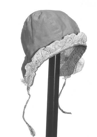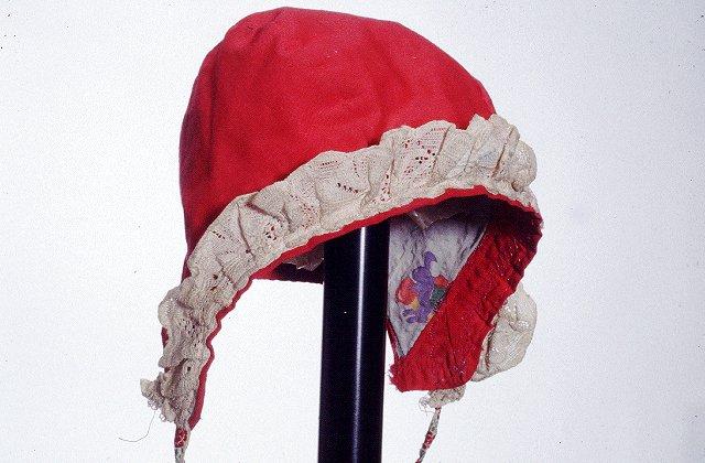 Kolmesta kappaleesta ommeltu pikkulapsen lakki. Etureunassa nauhakoristelu ja pitsireunus. Solmitaan leuan alta kukallisin nauhoin. Kangas punaista puuvillaa, vuori lasten lakanakangasta, lainekreppiä.