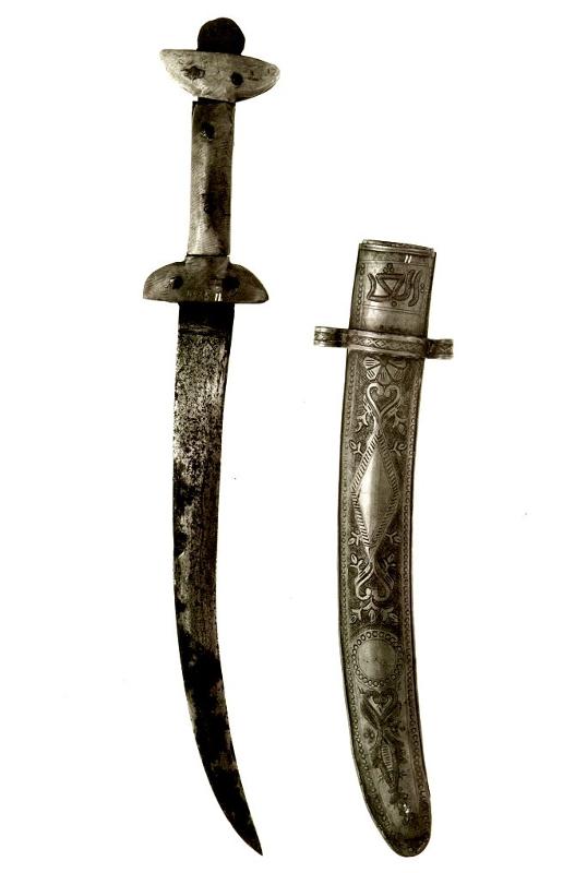 Käyräteräinen tikari (arab. sbula), jossa on puuosista niitein koottu karkeatekoinen kahva. Vähän kaartuva puutuppi on messinkikuorinen, ja siihen on kaiverretty yksinkertaisia kasviornamenttikuvioita. Sisäsivulla kuviot ovat geometrisia, mm. ympyröitä ja vinoneliöitä. Kantohihna puuttuu, ja kahva on osin rikkoutunut.