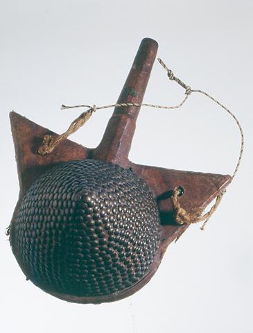 Puinen nahalla päällystetty ruutisäiliö, jossa on poikittain kartion muotoinen maha ja pitkä kapea kaula. Puulevystä tehty kartion pohja haarautuu ylhäällä kaulan molemmin puolin kolmiomaisiksi ulokkeiksi, ikään kuin sarviksi, joihin on sidottu kantonaru. Siihen on mustalla värillä - nyt jo haalistunut - maalattu yksinkertainen kahdeksansakarainen ristikuvio ympyrän sisälle. Toiselle puolelle kartioon on lyöty vieri viereen metalliniittejä. Nahka on repeytynyt useasta kohtaa, ja toinen sarvimaisista ulokkeista on haljennut.