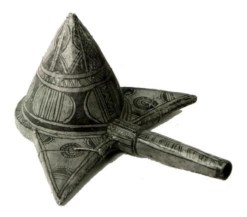 Puinen nahalla päällystetty ruutisäiliö, jossa on poikittain kartion muotoinen maha ja pitkä kapea kaula. Puulevystä tehty kartion pohja haarautuu ylhäällä kaulan molemmin puolin kolmiomaisiksi ulokkeiksi, ikään kuin sarviksi, joihin on sidottu kantonaru. Säiliöön on maalattu mustalla ja punaisella värillä geometrisia kuvioita, mm. mahan tasaiselle sivulle ympyrä ja sen sisäpuolelle risti.