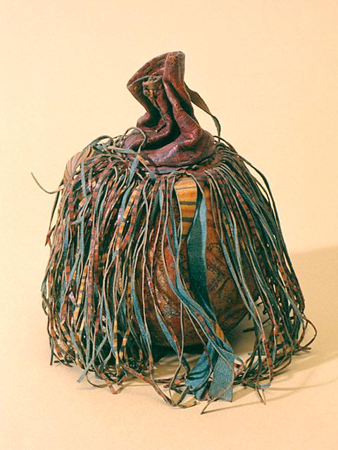 Pyöreä pullo, joka on valmistettu päällystämällä kalebassi ruskealla nahalla. Punaisesta pehmeästä nahasta on ommeltu astialle kaula, ja suu on mahdollista kiristää siihen pujotetun nahkanauhan avulla. Kaulan alapuolta kiertävät poikittain raidoitetut nahkahapsut. Astia on koristeltu huolellisesti maalaamalla punaisella ja mustalla värillä. Sivut on jaettu neljään pystyyn kenttään, joihin on kuvattu abstrakteja silmäkuvioita, mm. piikkireunaisia ovaali- ja puoliympyrämuotoja. Leveä risti jakaa pyöreäksi rajatun pohja-alueen neljään sektoriin ja neliön muotoiseen keskukseen. Silmäkuvion on uskottu suojaavan esinettä ja sen omistajaa pahalta silmältä.