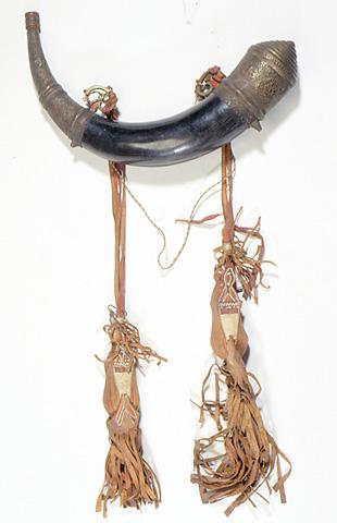 Ruutisarvi (berb. isk lbarud), joka on valmistettu harjalampaan (lat. Ovis tragelaphus/Ammotragus lervia; berb. udad/aoudad) tummanruskeasta sarvesta. Kiillotetun sarven molemmat päät on päällystetty messingillä ja koristeltu kauttaaltaan siselöidyin kasviornamenttikuvioin. Sisäsivulla kuviot ovat yksinkertaisempia. Suuria renkaita yhdistävään naruun on sidottu kaksi nahkaista luotipussia (berb. lemsarir, yks. lemsar tai Korkea-Atlaksessa askumas, yks. askums). Pussit on koristeltu maalatuin ja ohuilla nahkanauhoilla kirjotuin geometrisin kuvioin, ja niiden päissä roikkuvat pitkät tupsut. Sarven suussa ja renkaissa on jälkiä punaisesta väristä. Toinen renkaista on rikki, ja astian korkki puuttuu.