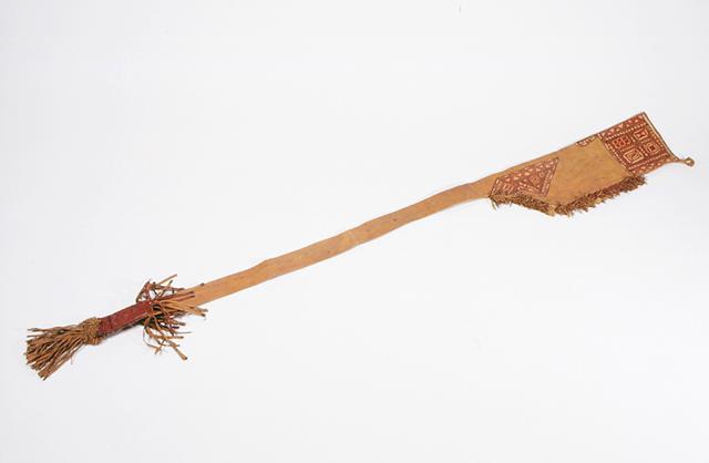 Vaaleanruskeasta nahasta ommeltu pyssynkotelo, jonka toinen pää on neliön muotoinen, toinen hyvin kapea ja pitkä. Leveän osan loppupäähän molemmin puolin on ommeltu nahkanauhoilla kolmion muotoiset nahka-applikaatiot, ja suuta kiertää leveä applikaatiokenttä. Applikaatiot ovat punaiseksi värjättyä nahkaa ja ne on koristeltu leikkaamalla värjätty pintaosa pois niin, että alta paljastuva ruskea nahka muodostaa kolmio-, neliö-, vinoneliö- ja ristiaiheiset kuviot. Kolmiot symboloivat silmiä, ja niiden on uskottu suojaavan esinettä ja sen omistajaa pahalta silmältä. Kapea pää on päällystetty punaisella nahkaosalla, joka on koristettu uurretuin rastein ja neliöin. Kotelon leveän osan saumaan on ommeltu hapsut, ja sen päässä on iso nahkatupsu.