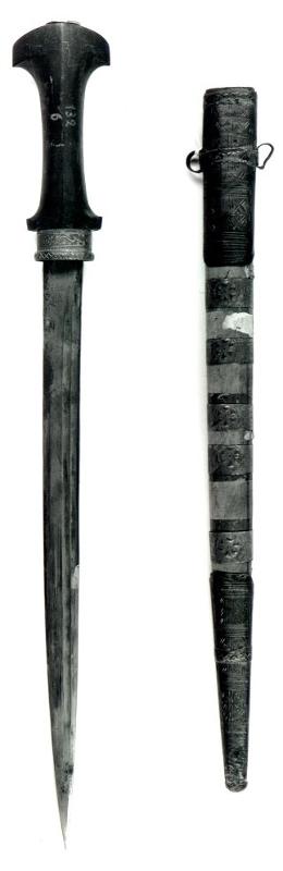 Tikari, jossa on suora uurteinen terä. Tumman puisen kahvan pää on leveä ja kaareva. Puinen tuppi on päällystetty nahalla ja koristettu metalliheloin. Suussa ja kärjessä on metallikuoret, jotka ovat päällipuolelta messinkiä ja koristetut yksinkertaisin kaiverretuin geometrisin kuvioin, mm. ristein ja siksak-linjoin. Sisäsivulta kuoret ovat hopeanväristä metalliseosta ja koristelemattomat.