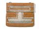 Ruskeasta nahasta ommeltu suorakulmainen laukku, jonka yläosa taipuu eteen läpäksi. Päällipuolelle on valkoisella - läpän alla punaisella - villalangalla kirjottu geometrinen kuviointi. Taakse yläreunaan on kiinnitetty metalliset lenkit. Niiden alapuolelle on kirjottu valkoisella, sinisellä ja vihreällä puuvillalangalla ornamenttikuviot. Kantohihna puuttuu.