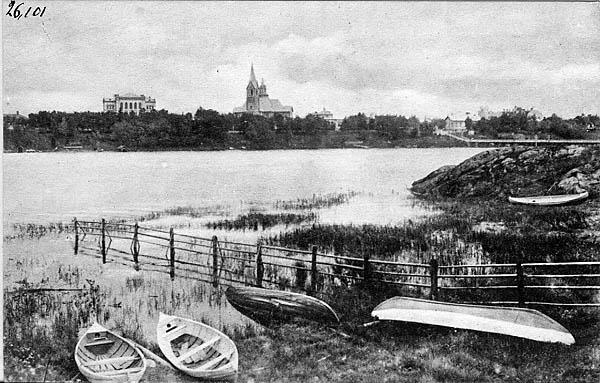 | postikortti: näkymä Vakkolahden yli keskustaan, taustalla reaalilyseo ja luterilainen kirkko |