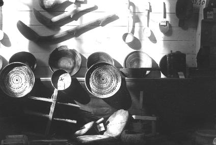 | valokuva: kauhoja, koreja, maitosiivilä, pusu, juustohäkki ym. astioita |