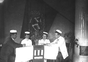 | valokuva: eräs osakunnan osasto pöydän ääressä, kesäjuhlat |