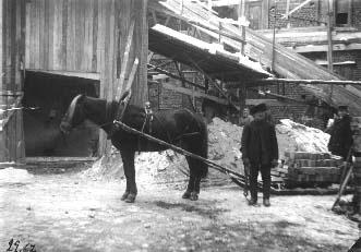 | valokuva: hevonen tiilikuormineen Liisankatu 17:n rakennustyömaalla |