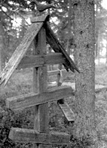 | valokuva: hautaristejä, etummaisessa katolla sielunlintu, taaempaan sidottu tuulipaikka |
