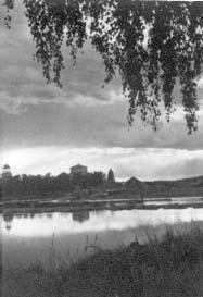 | valokuva: Lieksanjoki, taustalla kirkko ja kellotapuli |