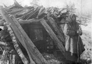 | valokuva: Hillan ämmä itse rakentamansa mökin edessä Jänisjärven Kintsinlahden rannalla |