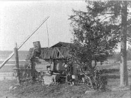 | valokuva: ränsistynyt hirsimökki, pihalla vinttikaivo |