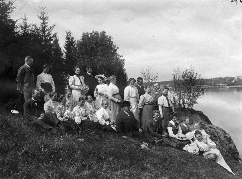 | valokuva: luokkakokoukseen osallistuneita seminaarilaisia, taustalla Pitkäsilta |