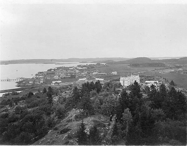 | valokuva: näkymä Kuhavuorelta Kymölään päin, edessä sairaala |