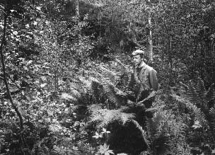 | valokuva: luonnontieteilijä K. H. Hällström (myöh. Pankakoski) saniaisten (struthiopteris) keskellä |