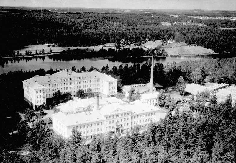 Vuonna 1927 perustettu Moision mielisairaala kaakon-idän puolelta kuvattuna. Rakennuksen takana näkyy Moisionlampi.