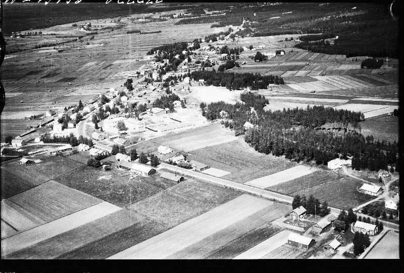 Vetelinjokilaakson peltomaisema luoteen suuntaan. Keskellä Kainuun talot ja keskipisteestä hiukan vasemmalle taasen Vetelin Yhteiskoulun kaksi isoa rakennusta.