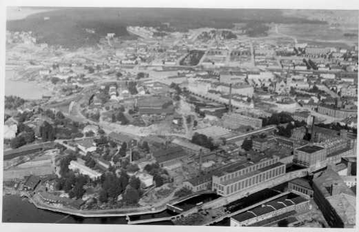 Kuvassa näkyy Tampellan teollisuusalue Tammerkosken yläjuoksun itärannalla.