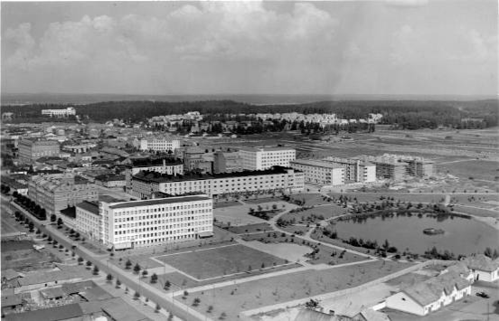 Tampereen Tammelaa: Oikealla Sorsapuisto, etualalla kaupungin teurastamon rakennuksia