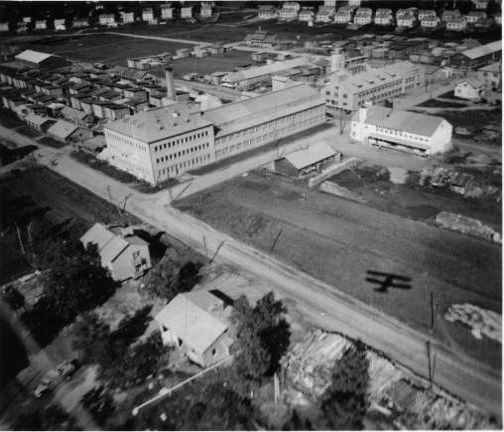 | ilmavalokuva: Lahti, Sopenkorpi Oy:n huonekalutehdas, vieressä Kauppakunta (varasto?), lautataapelit, pientaloalue |