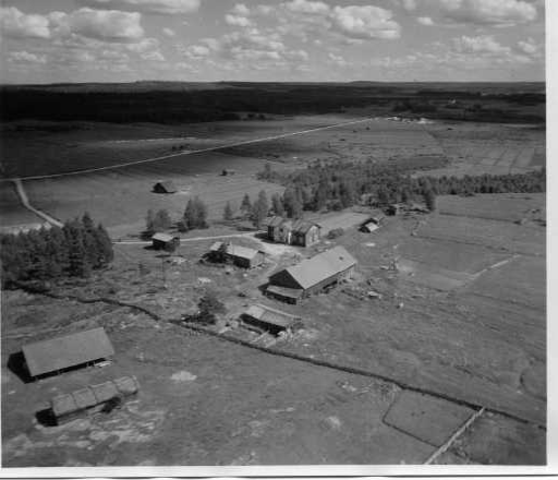 | ilmavalokuva: Virrat, toimitusjohtaja Niilo Karhumäen maatila, peltoaukeat, maalaistalon pihapiiri rakennuksineen |
