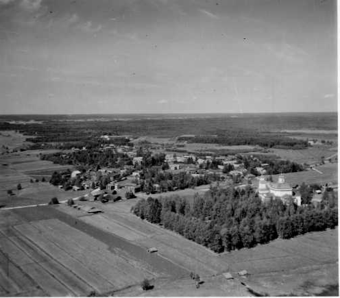 | ilmavalokuva: Alajärvi, näkymä kirkonkylään, 1836 valmistunut empiretyylinen ristikirkko (C |