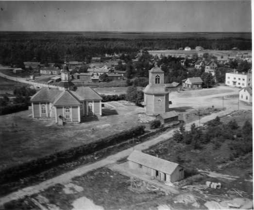 | ilmavalokuva: Himanka, kirkko, etualalla ulkorakennus, taustalla asuinrakennuksia ulkorakennuksineen |