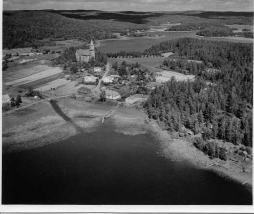 | ilmavalokuva: Luhanka, muutamia asuinrakennuksia ulkorakennuksineen, kirkko (Josef Stenbäck 1893), Pilkanselkä |