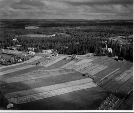 | ilmavalokuva: Tuusniemi ?, pellot, muutama asuinrakennus, kirkko, taustalla järvi |