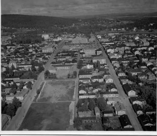 | ilmavalokuva: Kuopio, näkymä Haapaniemenkadun ja Puijonkadun suuuntaisesti kohden toria ja kaupungintaloa |