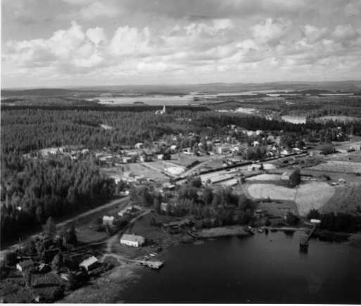 | ilmavalokuva: Siilinjärvi, ranta, rautatie, asutusta, taustalla kirkko (Pekka Väänänen, 1923) |