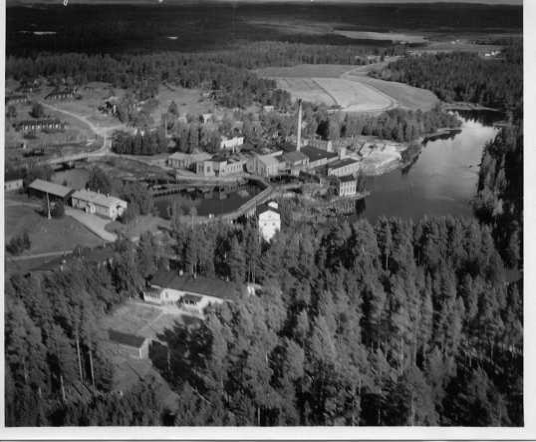 | ilmavalokuva: Juankoski, Juantehdas Oy (Kymin Oy?) tehdasalue kosken? rannalla, työntekijöitten asuntoja, peltoja, metsää |
