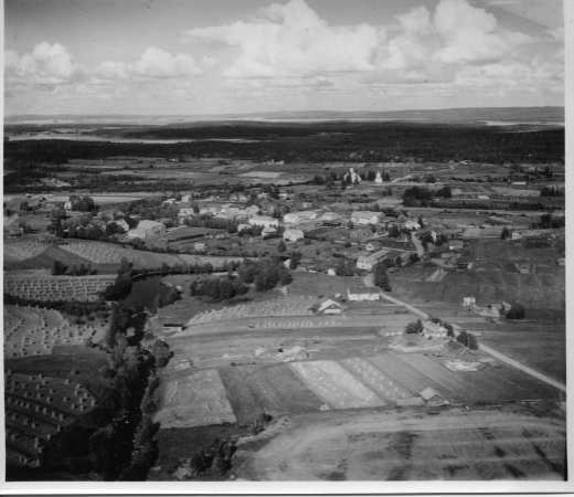 | ilmavalokuva: Juuka, kirkonkylää, peltoja, joki, tiheähkö keskittymä asuin- ja liikerakennuksia, maatalousrakennuksia, taustalla kirkko (E |