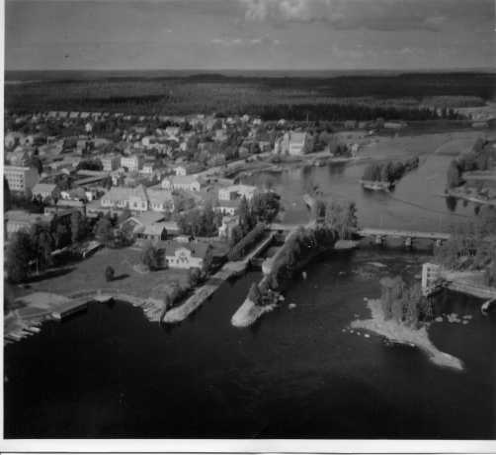 | ilmavalokuva: Joensuu, Pielisjoen kanava, Pielisjokea saarineen, mahdollisesti uittopuomit, kaupungin asutusta kanavan puoleiselta rannalta, taustalla mm |