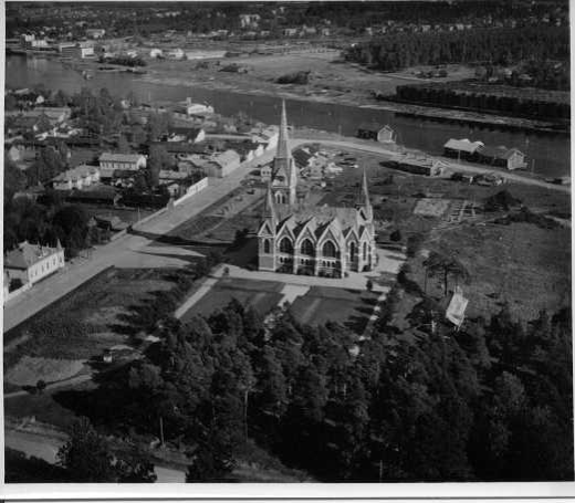 | ilmavalokuva: Joensuu, luterilainen kirkko, puisia asuinrakennuksia, peltoa?, Pielisjoki ja sen takana mm |