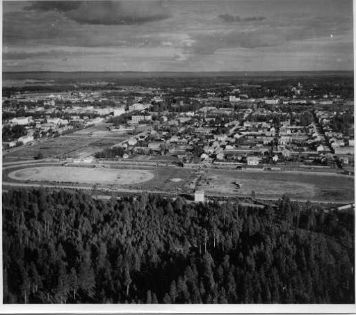 | ilmavalokuva: Joensuu, näkymä urheilukentän/raviradan suunnalta kohden keskustaa |