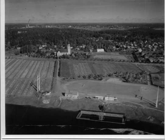| ilmavalokuva: Kuusankoski, Kymijoen rantaa, uitettavaa puuta, ilmeisesti uimalaitos, urheilukenttä, peltoa, taaempana kirkko (A |