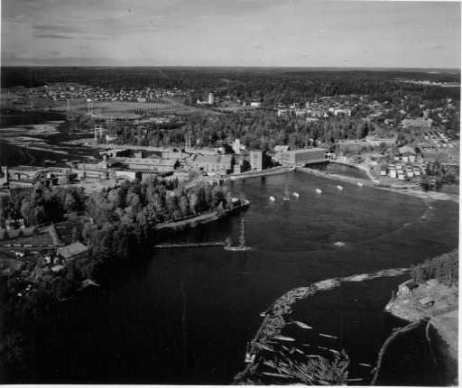 | ilmavalokuva: Kuusankoski, Kymijoki, Kymi Oy:n (Kymintehdas) tehdasrakennukset, voimalaitos, taustalla Kuusanniemen asutusta ja mm |